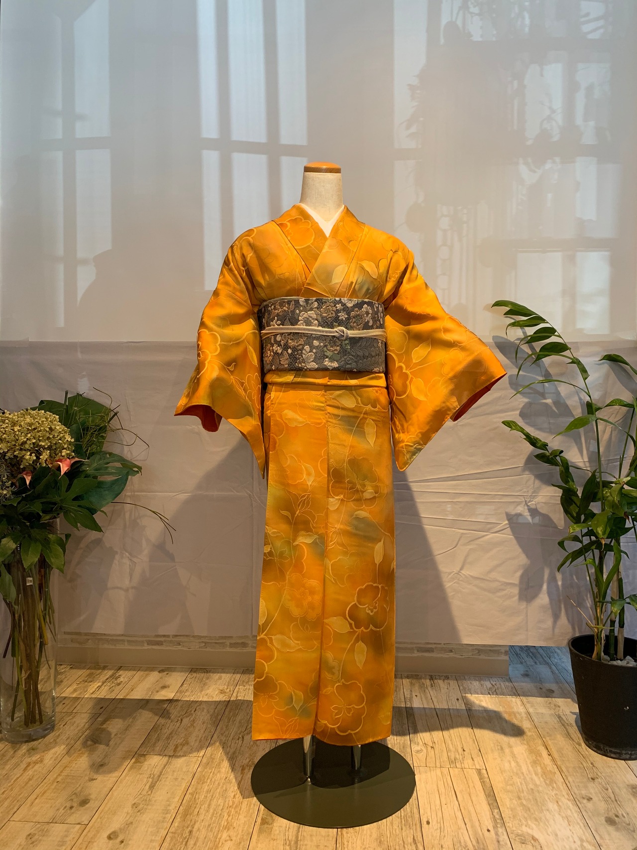 葉っぱ地紋を興した立体感のある柄でスッキリしたカジュアル着としてランチ会など、秋から活躍しそうな着物です^_^