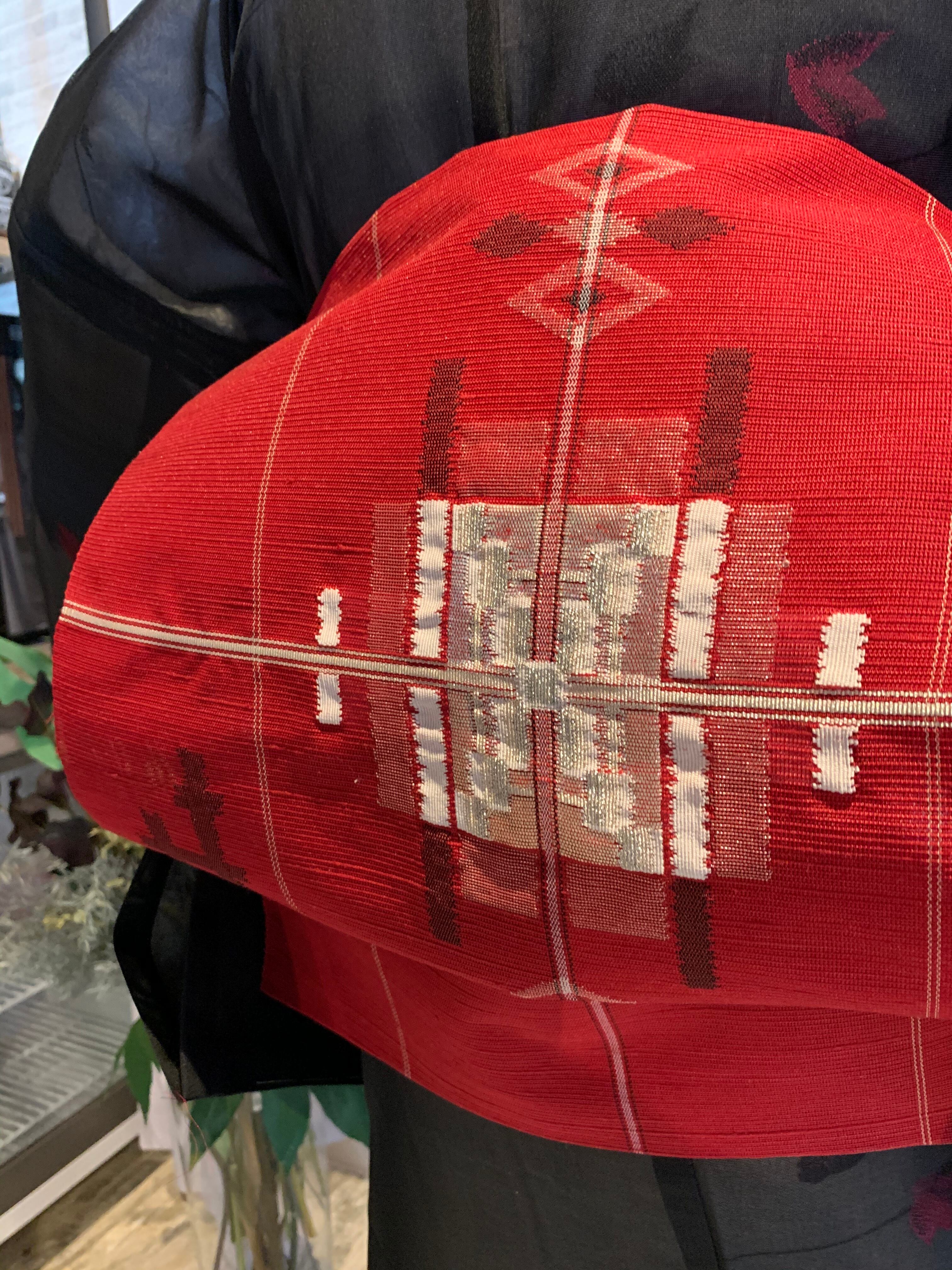 夏の名古屋帯です。大人でも使っていただける落ち着いた赤なので紬や小紋のお洒落物にお使いください^_^