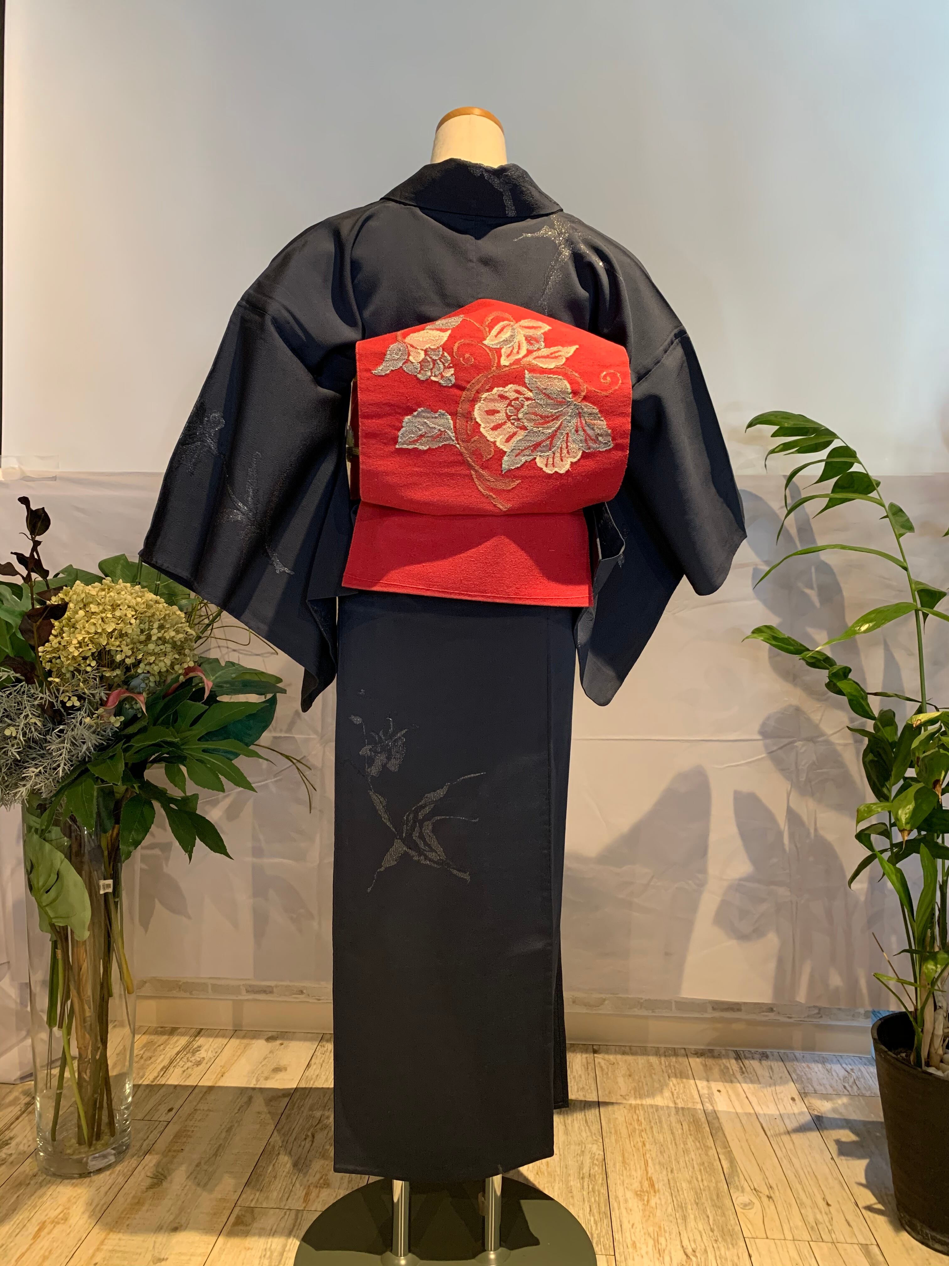 ざっくりした錆び朱の紬糸に唐花の柄を織り出したかがりの帯です。名古屋なので一重太鼓で、気楽な紬やお召しなどに巻いてください。