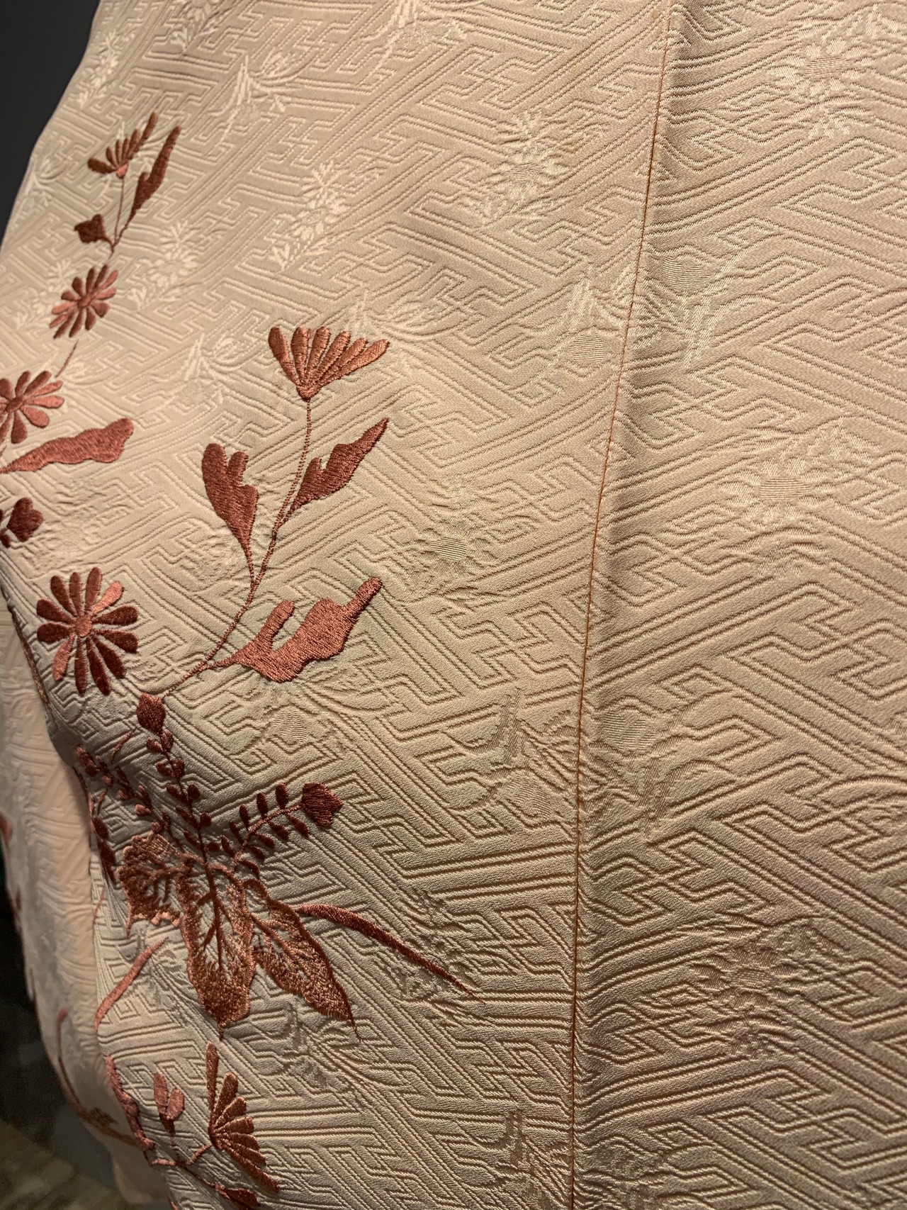 薄いベージュピンクの地に絞りと刺繍が施された可愛い羽織です。